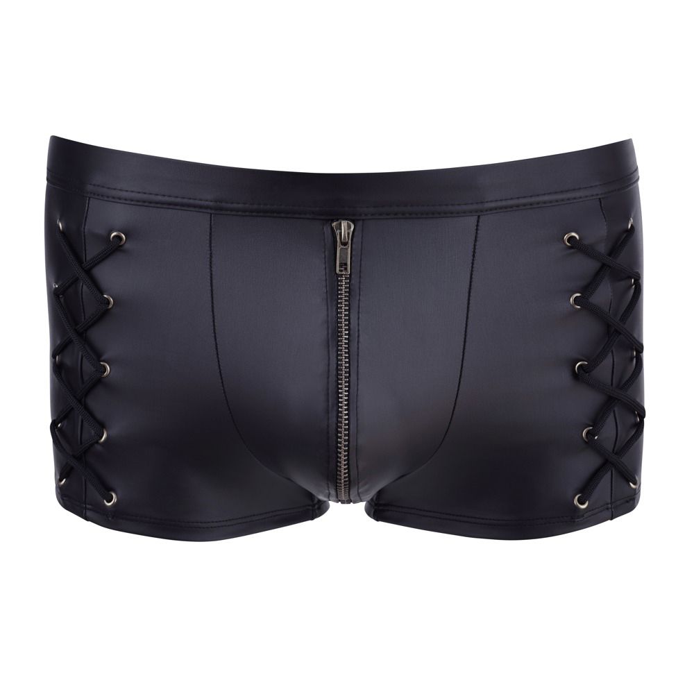 Delicate, black pants with an underlaid brass zipper in the front. With prominent lacings on the sides.